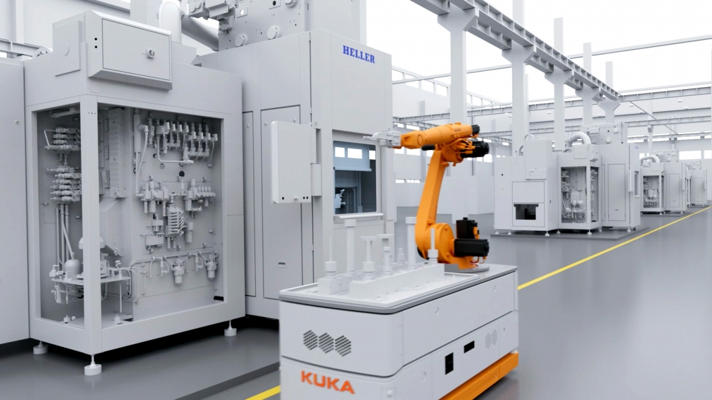 Für KUKA und die HELLER Maschinenfabrik haben wir eine Realfilm-3D-Kombi über einen autonom- und freifahrenden Roboter produziert. Mit diesem System können Werkzeugmaschinen automatisch be- und entladen werden.
